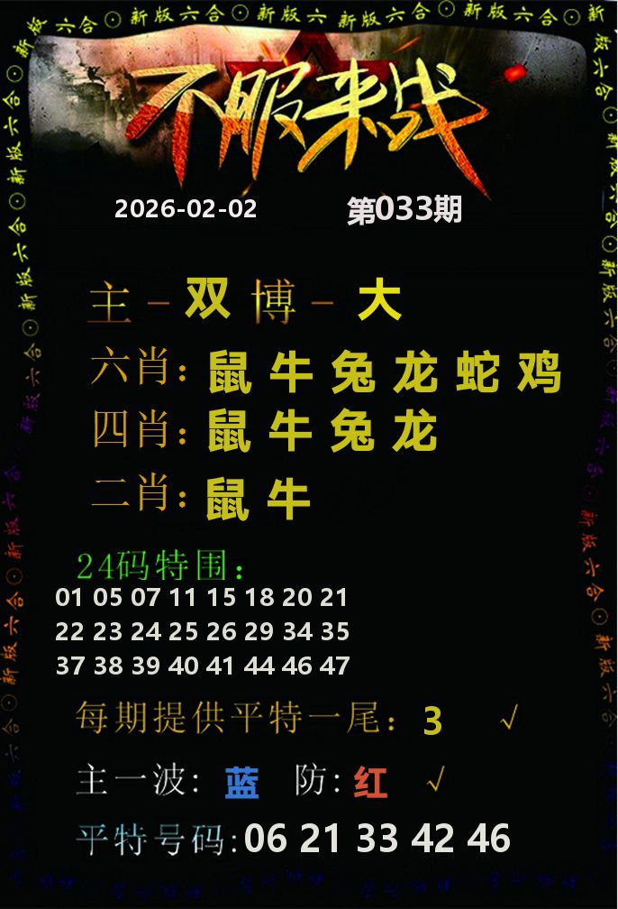 033期:A级大公开:676383.COM长跟必赢 033期四肖:【龙马牛鼠】 八码:【02 26 12 24 05 41 06 42】 033期三肖:【龙马牛】 六码:【02 26 12 24 05 41】 033期二肖:【龙马】 四码:【02 26 12 24】 033期:一肖一码【龙02】信心十足,大胆下注!